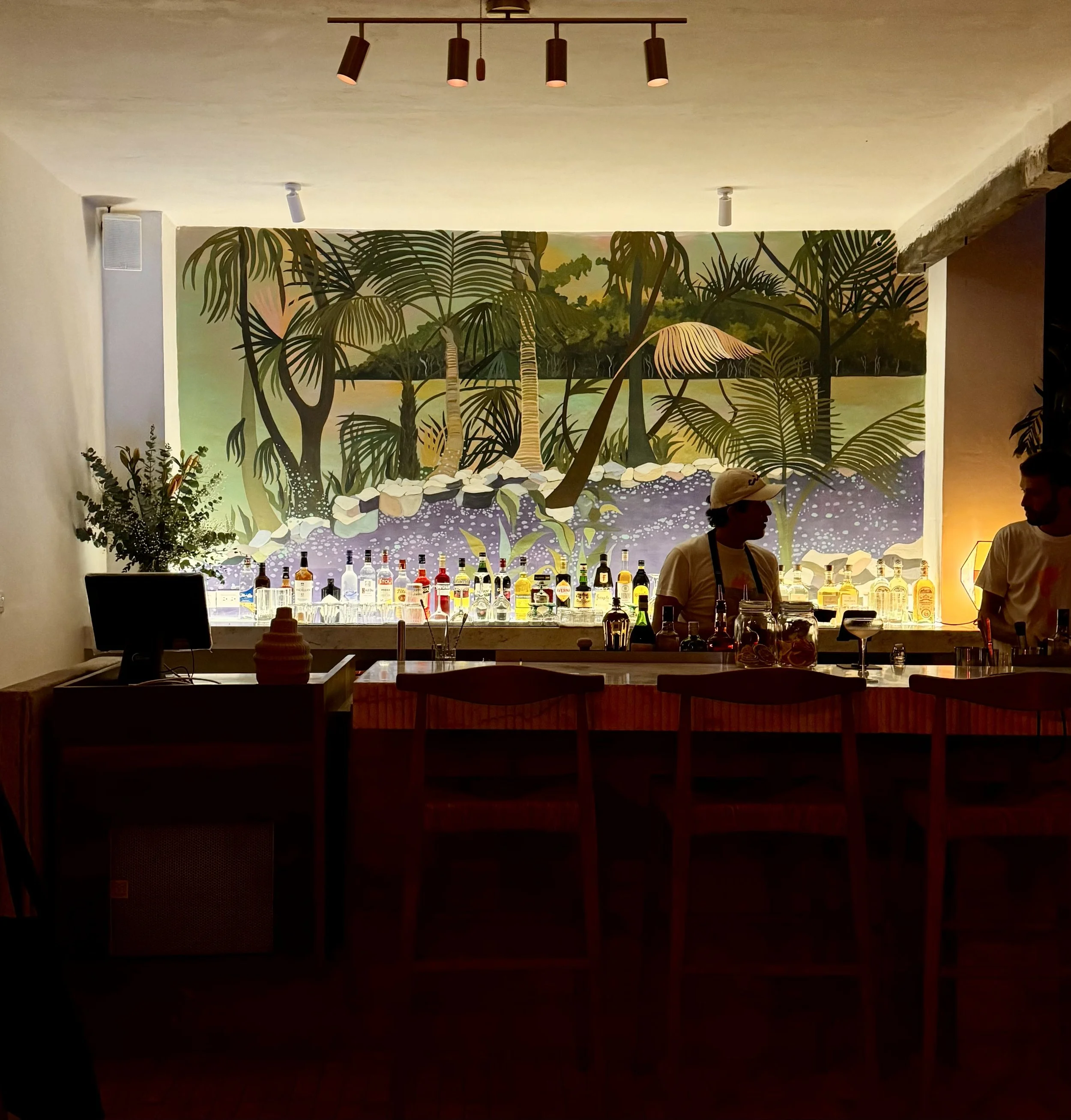 In October 2025, I was invited by the new Italian restaurant in Tulum hotel zone Check Point Ciao Osteria, to create a piece for their bar area. The mural was created while the restaurant was still under construction and was completed in time for its opening in December 2025. Titled "Cenote Utopia", the mural coexist with an eclectic environment alongside other artworks by local artists. A must-visit if you are in Tulum.